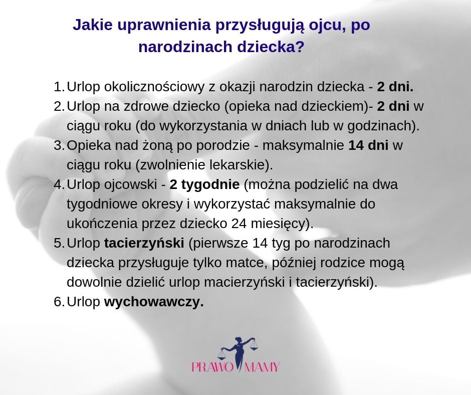 Ile konkretnie dni może przysługiwać ojcom po narodzinach dziecka? Czy urlop ojcowski, to zamiennik nazwy urlopu tacierzyńskiego? Czy to, prawda, że możemy skorzystać z opieki nad żoną po porodzie? Czy przysługuje opieka na zdrowe dziecko?